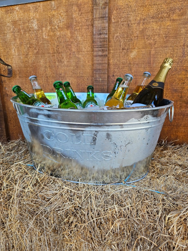 Smaller sized metal tubs which are perfect to sit on top of the barrels, fits approx 10 beer bottles or 4 wine bottles with ice in between. Hire period is 3 days.
